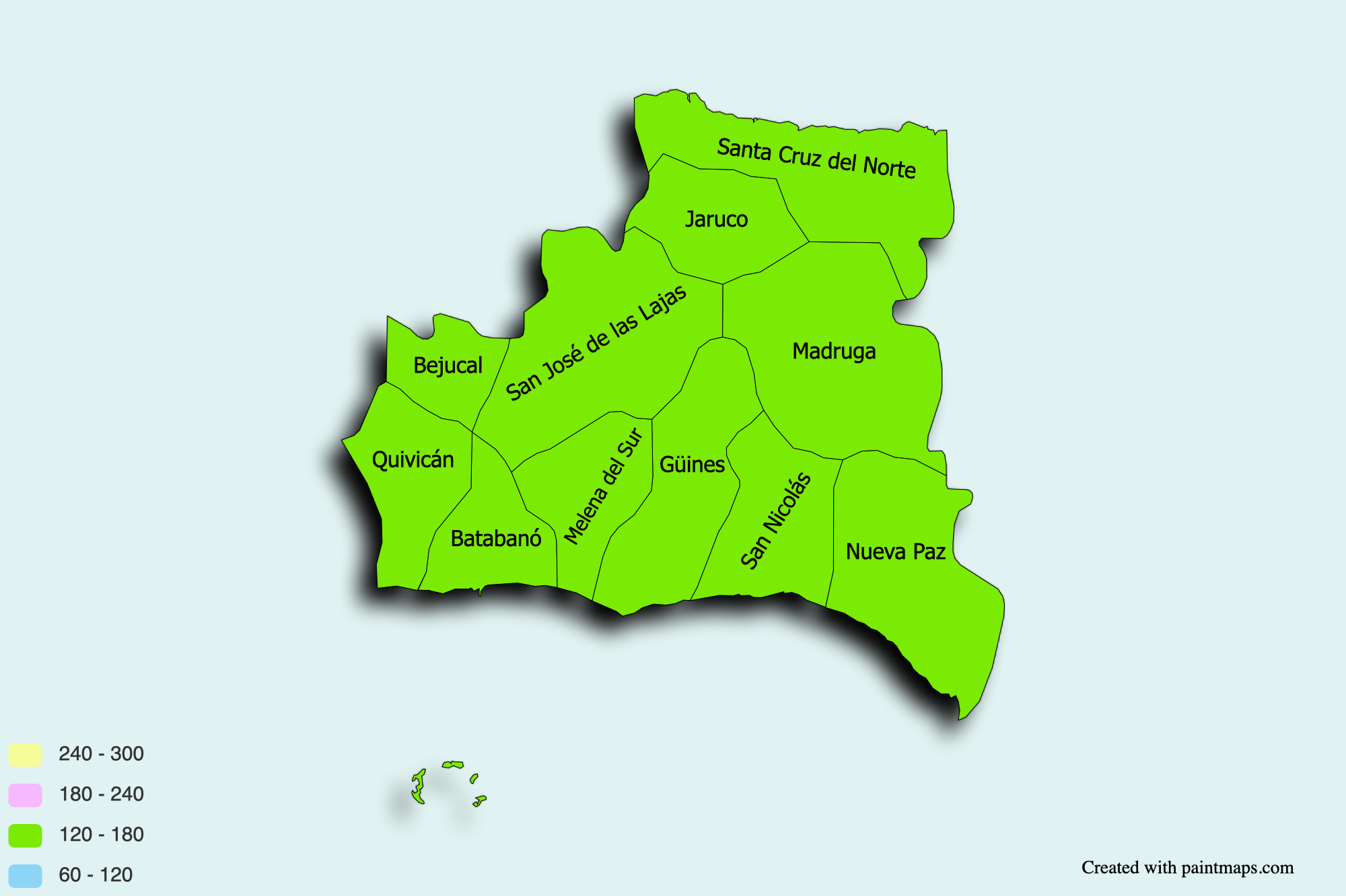 6. Condado de Mayabeque: Bejucal, Quivicán, Batabanó, Melena del Sur, San José de las Lajas, Jaruco, Santa Cruz del Norte, Madruga, Güines, San Nicolás, Nueva Paz.