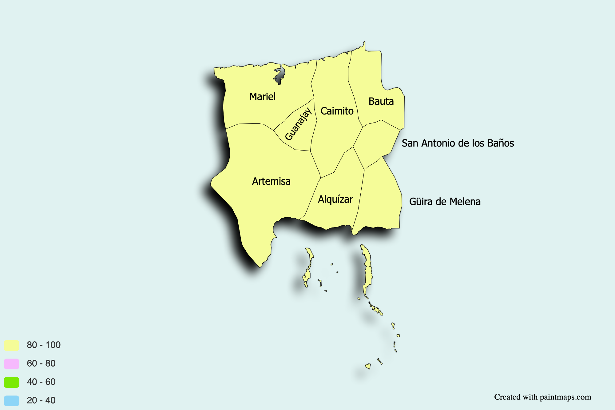 5. Condado de Artemisa. Artemisa, Mariel, Guanajay, Caimito, Bauta, San Antonio de los Baños, Güira de Melena, Alquizar.